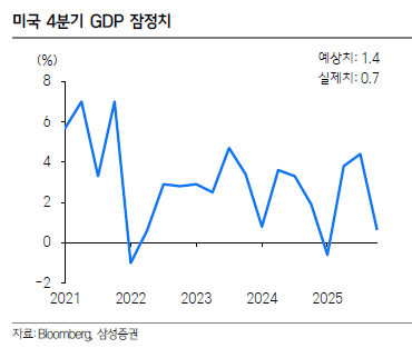· 유가 급등과 1월 근원 PCE 물가 지표의 반등이 상방 요인으로 작용했지만, 25.4Q GDP가 지난 1차 집계 당시의 절반 수준인 0.7%로 하향 조정
