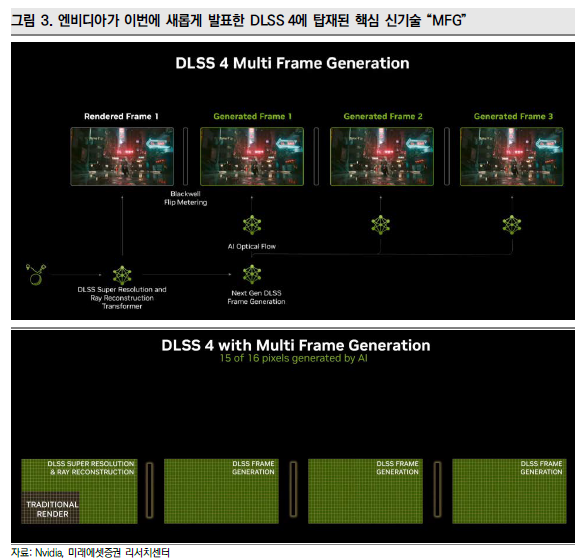 · AI 업스케일링 기술인 DLSS의 최신 버전, DLSS 4. 새롭게 탑재된 '멀티 프레임 생성(MFG)' 기능은 기존 렌더링 방식 대비 최대 8배까지 프레임률을 향상