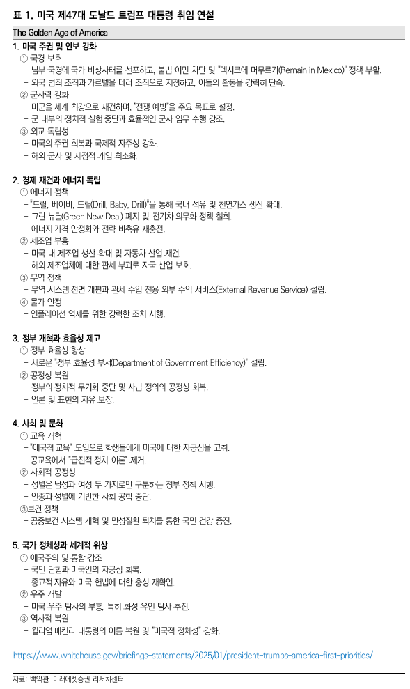 · 트럼프는 취임식에서 아메리카 퍼스트를 강조하며 불법이민자 추방과 화석연료 시추 등 강경한 정책을 발표