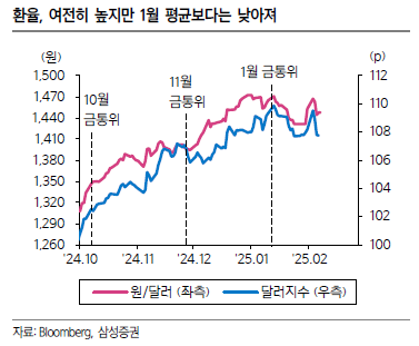 · 환율은 여전히 높지만 12월말 기록한 1,486원과 1월 평균 1,455원 수준 대비 낮은 1,440원 수준에서 등락