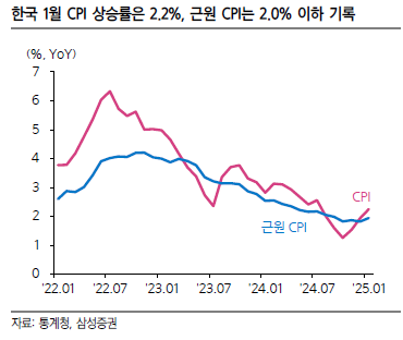 · 소비자 물가(YoY) : 11월 1.5% → 12월 1.9% → 1월 2.2%(근원 CPI는 1.9% → 1.8% → 1.9%)