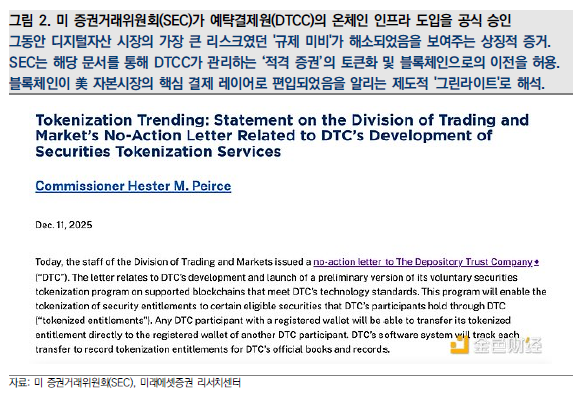 · DTCC(미국 중앙예탁결제기관)의 온체인 토큰화 승인과 Clarity Act(미국 가상자산 명확화 법안)의 통과는 시장 참여자들에게 명확한 가이드라인을 제공하며 불확실성을 제거할 것으로 기대
