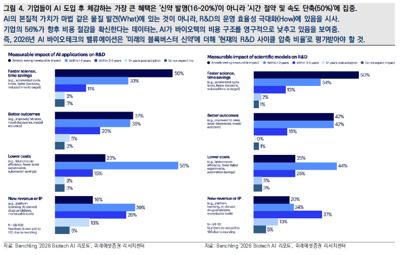 · 2026년 바이오 투자의 핵심 ROI는 AI 에이전트가 사내 서버에 방치된 ‘죽은 데이터(Legacy Data)’를 채굴하고 구조화하여, 중복 실험을 방지하고 실패 비용을 통제함으로써 통상 7년이 소요되던 R&D 사이클을 3년으로 압축하는 ‘운영 효율성’에서 발생할 것